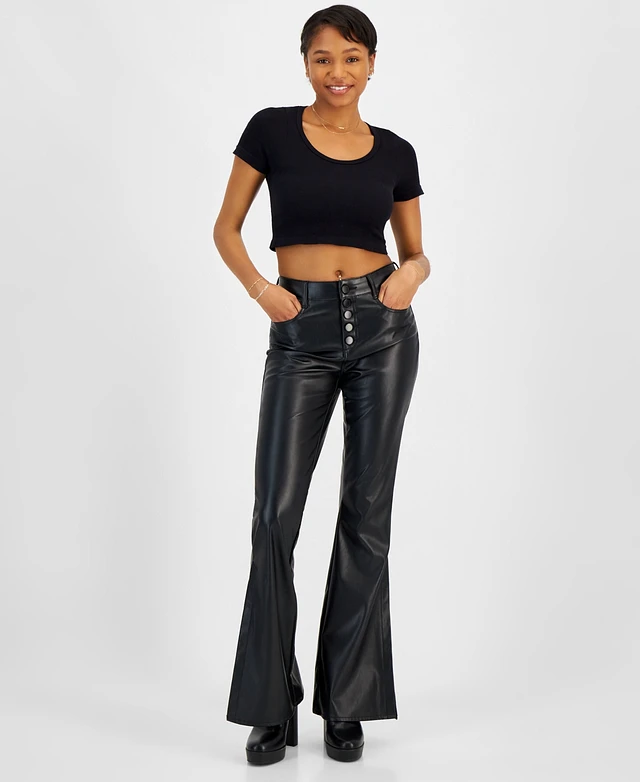 Dollhouse Juniors' Exposed Button-Fly Faux-Leather Flare Pants