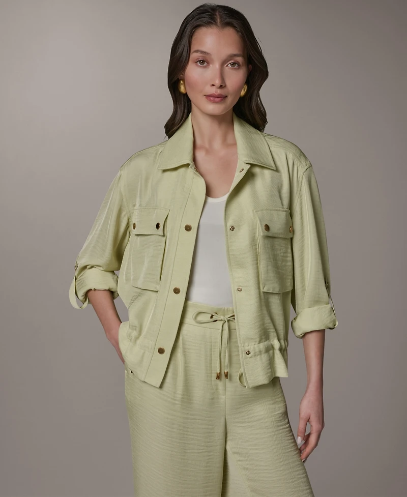 Refine off-duty layering with this Donna Karan New York collared jacket, shaped with drop shoulders and a snap-front closure that delivers a laid-back profile and a quick, effortless wear. Front flap pockets offer secure storage for daily essentials, while the petite-friendly length supports balanced proportions.