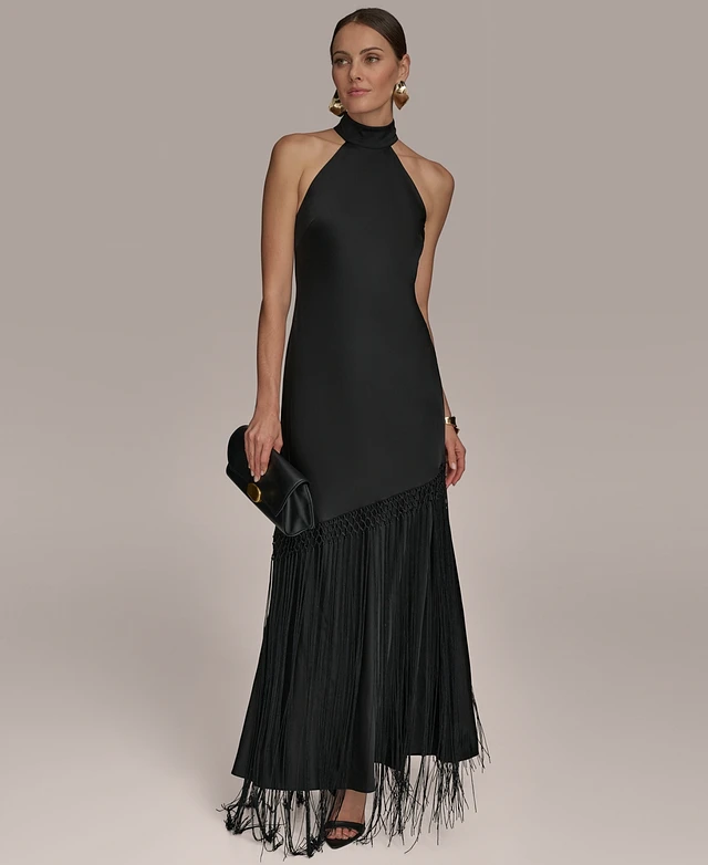 Donna Karan New York Women's High-Neck Fringe-Trim Gown