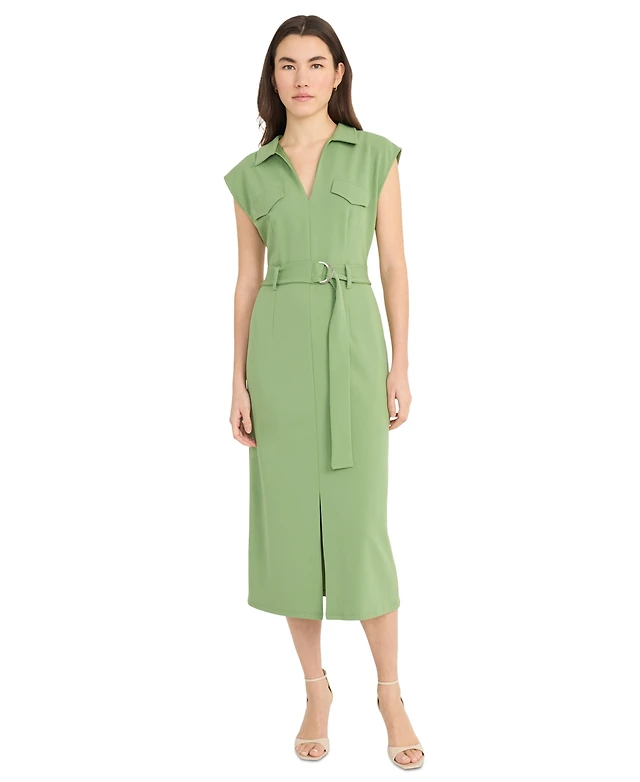 Donna Morgan Women's Belted Split-Neck Midi Dress