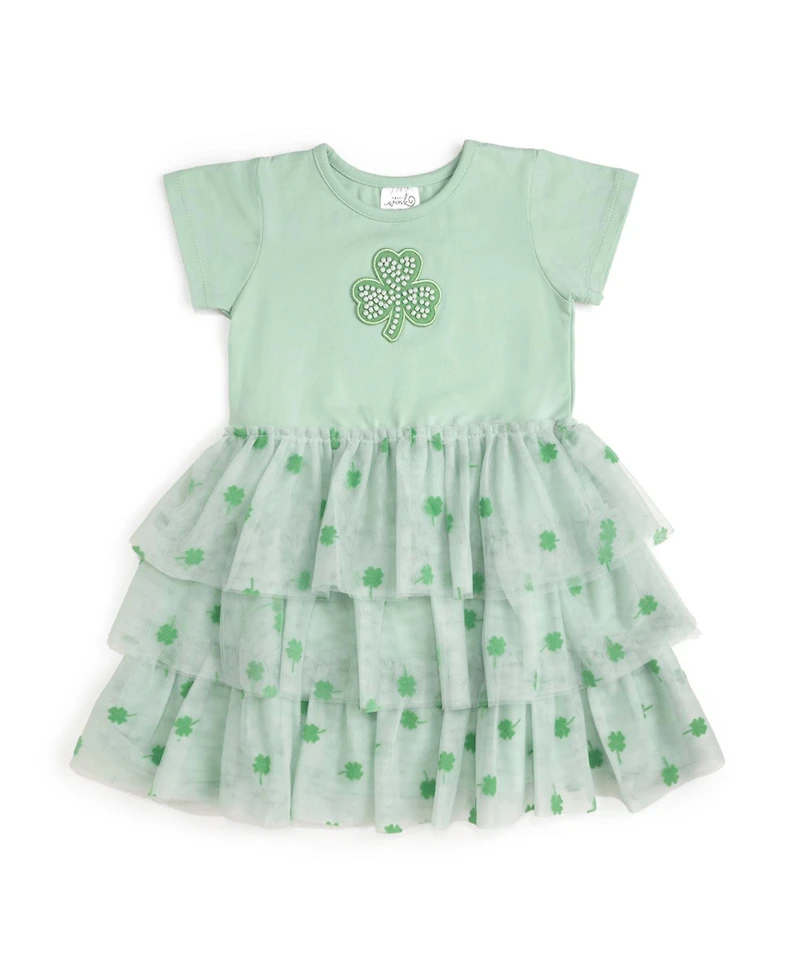 Your little one will be the ultimate lucky charm for St. Patrick's Day fun and parades in this adorable mint-green dress, featuring a pearly embellished shamrock and a fluffy, layered tutu covered in soft, flocked shamrocks!