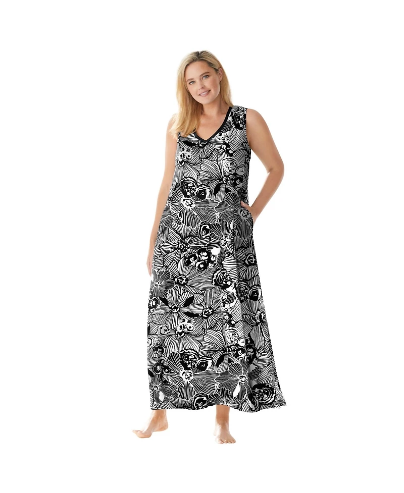 Our Trapeze V-Neck Lounger has a full sweep and side slits that create easy movement and give you the perfect relaxed fit. The V-neckline and sleeveless design provide all-day breathability. Ribbing at neckline and armholes. Side pockets52" length. Cotton/poly, imported. Machine wash