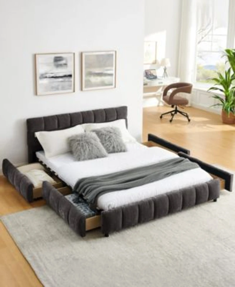 Transform your bedroom into a high-end retreat with this stunning grounded upholstered platform bed. Designed for the modern home, this piece masterfully blends a contemporary, low-profile silhouette with the timeless luxury of thick, tactile chenille fabric. Its unique ""grounded"" aesthetic offers a profound sense of stability and serenity, establishing it as the perfect centerpiece for your peaceful sanctuary. Every inch of the frame is enveloped in premium, ultra-soft chenille, creating a cocoon-like environment that invites you to unwind completely. Beyond its captivating beauty, this bed excels in functional design, featuring spacious storage drawers with smooth-gliding rollers discreetly integrated beneath the sleek exterior. Ideal for upgrading your master suite or guest room, it delivers a sophisticated, clutter-free lifestyle while ensuring uncompromising comfort and style.