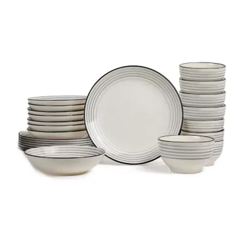 Built for everyday use, the Zeke Earthenware Dinnerware Set was crafted from the highest quality, scratch-resistant earthenware. Its classic, smooth, and sturdy design is complemented by a strong glossy finish ringed with multiple black accents. So, whether you're waking up to a light-hearted meal or fueling up with a hearty dinner, Zeke accommodates every bite, no matter what. This set includes: Large 10.5" dinner plates, 5.5" cereal bowls8" pasta bowls.