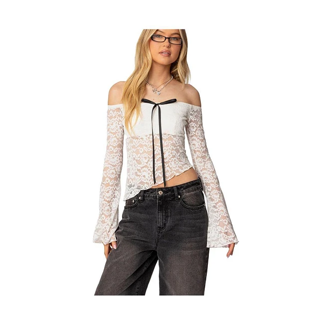 Edikted Women's Kessa Sheer Lace Off Shoulder Top