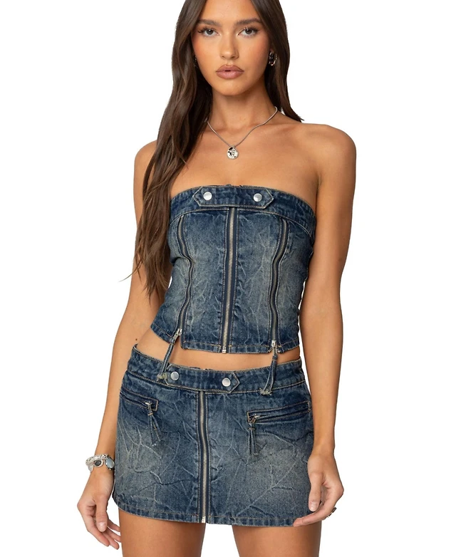 Edikted Womens Guinevere Zip Washed Denim Corset