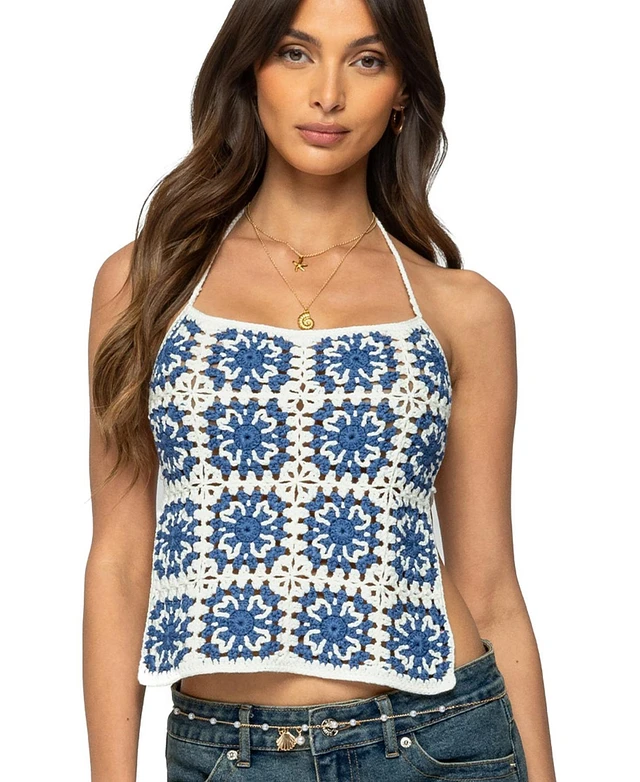 Edikted Womens Sheer Crochet Babydoll Halter Top