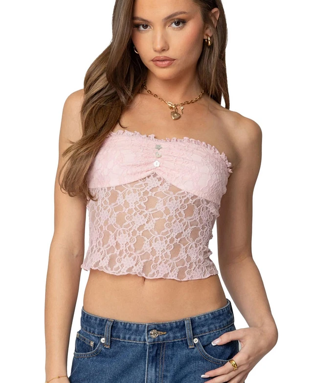 Edikted Womens Odilia Sheer Lace Strapless Top