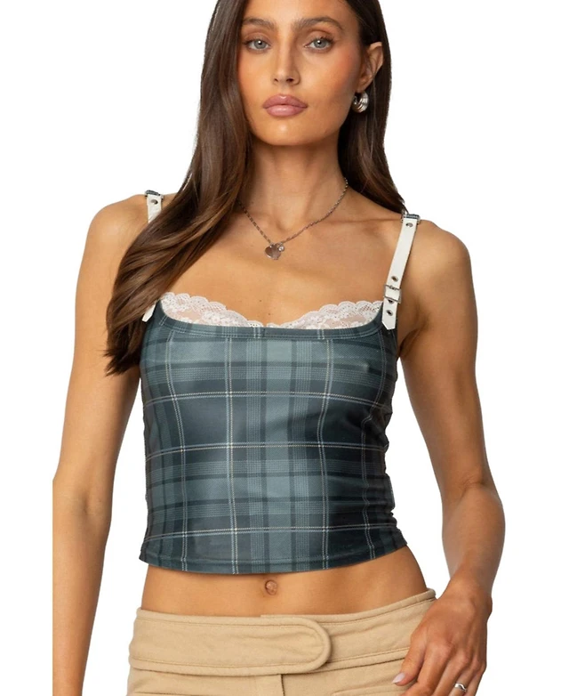 Edikted Womens Plaid Lacey Peekaboo Top