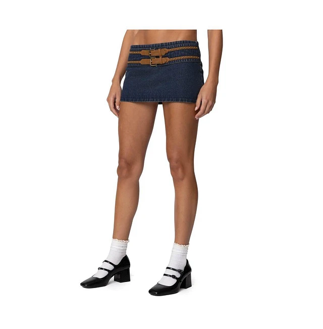 Edikted Womens Sky Double Buckle Denim Mini Skort