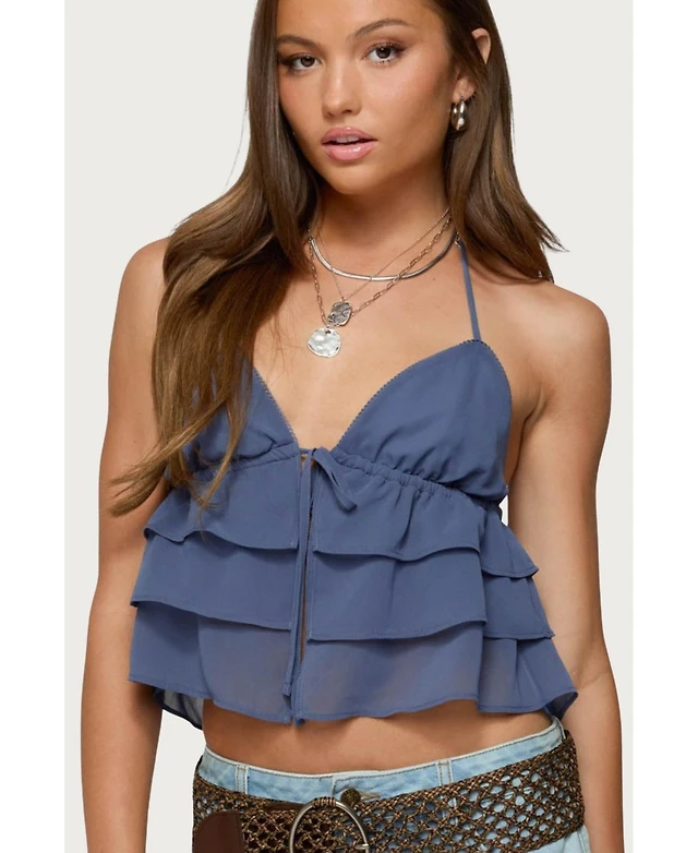 Edikted Women's Chiffon Printed Tie Front Ruffle Top
