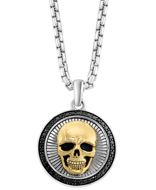 Effy Men's Black Spinel Skull Head 22" Round Disc Pendant Necklace (3/8 ct. t.w) in Sterling Silver, 14k Gold-Plate, & Black Rhodium-Plate