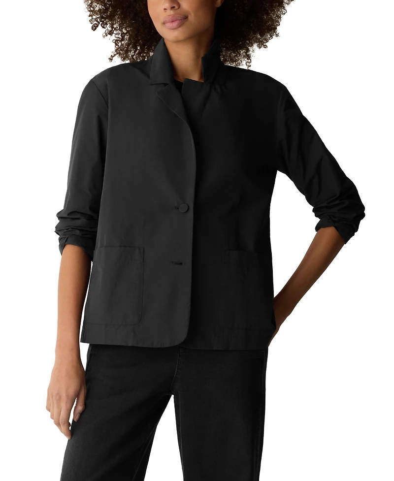 Practical yet polished, this Eileen Fisher blazer features a notch collar and front patch pockets. The sleek silhouette with a subtle sheen offers a versatile, modern layer.