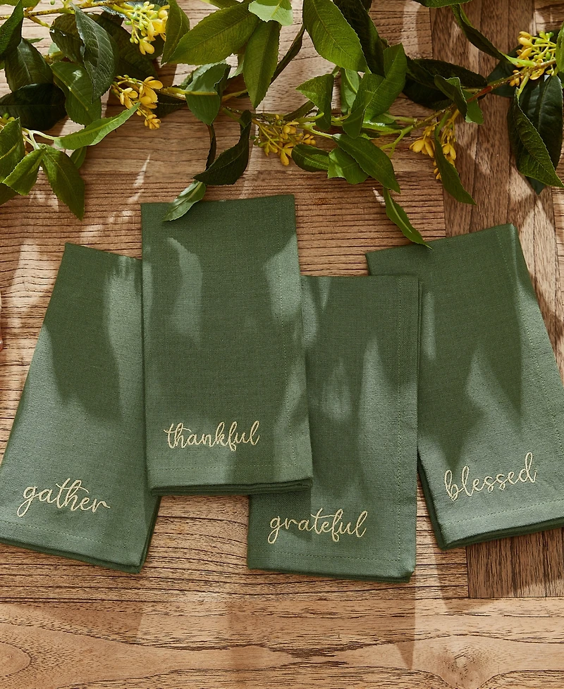 Add a warm and inviting touch to your table setting with the harvest sentiment napkins. Offered in 4 solid colors, these napkins feature the charming autumnal inspired words, ""gather"", ""blessed"", ""thankful"" and ""grateful"" embroidered in gold-tone thread. 100% cotton, this set of 4 napkins is machine washable for easy care. Finished off with a delicately hemmed edge to provide a finished look and prevent wear and tear, this harvest themed napkin set is perfect for special occasions, events, parties, thanksgiving celebrations and everyday use throughout the fall season.