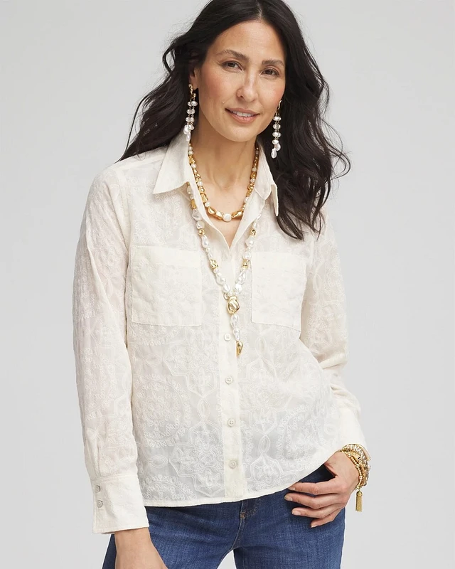 Embroidered Eyelet Button-down Top