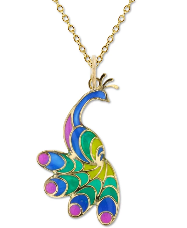 Enamel Peacock 18" Pendant Necklace in 14k Gold