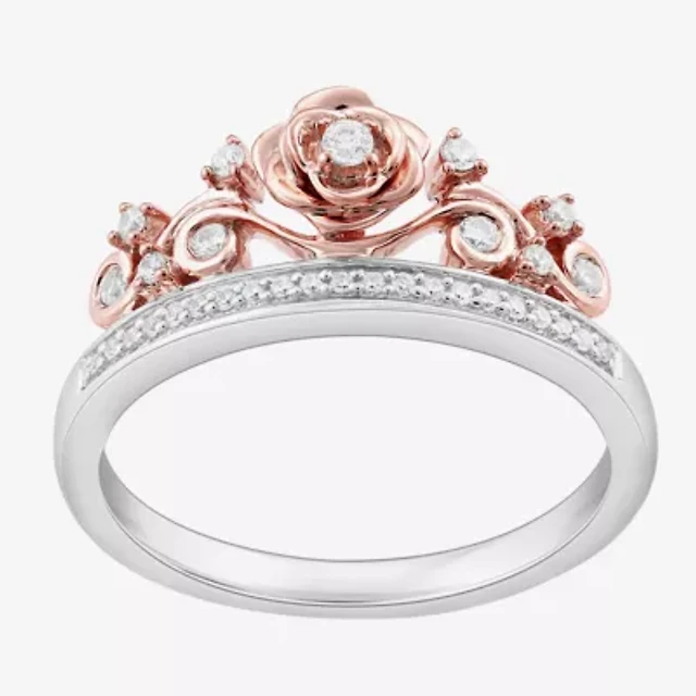 Enchanted Disney Fine Jewelry Womens 1/6 CT. T.W. Natural White Diamond Sterling Silver Flower Beauty and the Beast Belle Princess Cocktail Ring