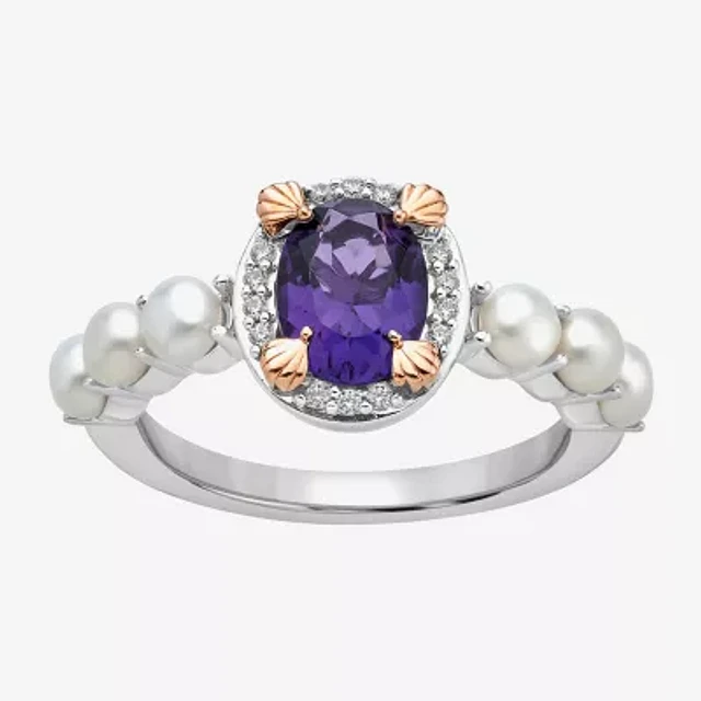 Enchanted Disney Fine Jewelry Womens Diamond Accent 3MM Lab Created Purple Cultured Freshwater Pearl Amethyst 14K Rose Gold Over Silver Oval Ariel Princess Side Stone Solitaire Cocktail Ring
