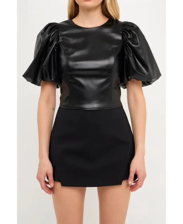 endless rose Women's Pu Leather Puff Sleeve Cropped Top