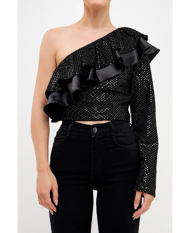 endless rose Women's Satin Contrast Velvet One Shoulder Top