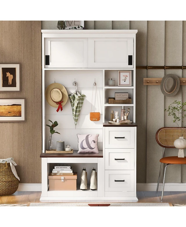 Streamdale Space-Saving Hall Tree Sliding Doors, Silvery Hooks, Mudroom Bench, Shoe Storage, Cushion