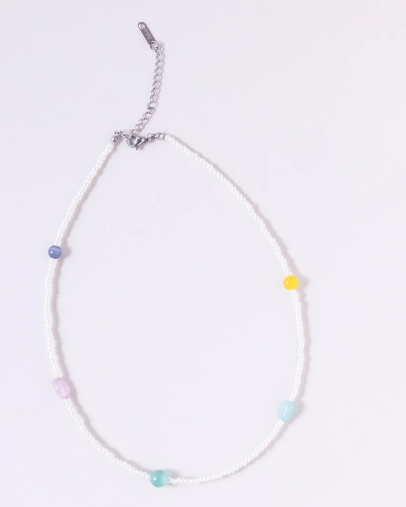 Radiate pure joy with this elegant pearl strand necklace, beautifully interrupted by a vibrant parade of colorful, genuine stones! Its delicate balance of classic sophistication and playful whimsy makes it the perfect accessory to brighten up a simple white tee or add a touch of charm to your favorite brunch outfit. Details Beaded Necklace Lobster Claw Clasp Adjustable Length Content + Care Acrylic Genuine Stones Stainless Steel While most of our gold plated pieces have a water-resistant coating to keep up with your everyday moments, we recommend removing them during intense activities and cleaning with a soft cloth weekly to keep them in good condition.    Size · Length: 8" with a 3" extender chain for adjustable length.