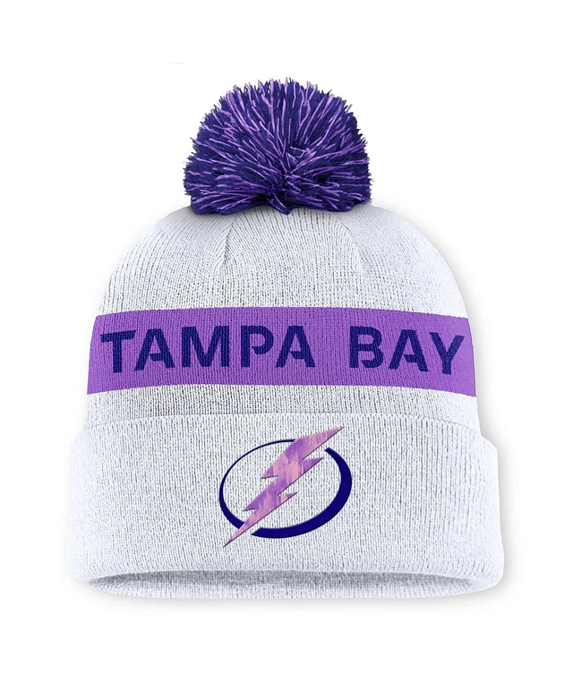 Fanatics Men's White Tampa Bay Lightning Hockey Fights Cancer Cuffed with Pom Knit Hat