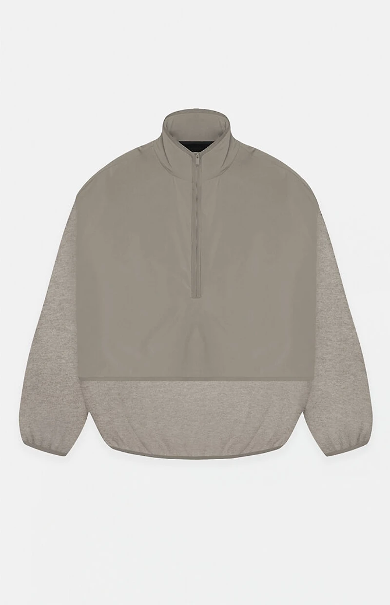 The Fear of God Essentials Dust Heather Grey Nylon Fleece Mock Neck Sweatshirt features a layered design with a nylon upper and cozy fleece lower. It gets finished off with a mock neckline, a half-zip front closure, long sleeves, contrast stretch binding, side seam pockets, and a rubber brand label at the wrist.