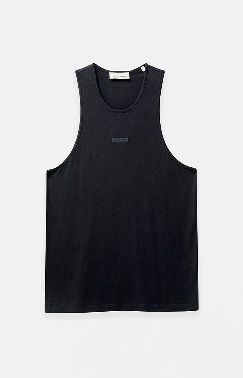 The Jet Black Tank Top from Fear of God ESSENTIALS is crafted from a lightweight jersey knit fabric with wide fixed straps and a clean U-neckline. A soft-touch rubberized logo at the front and a subtle graphic at the upper back complete the look.