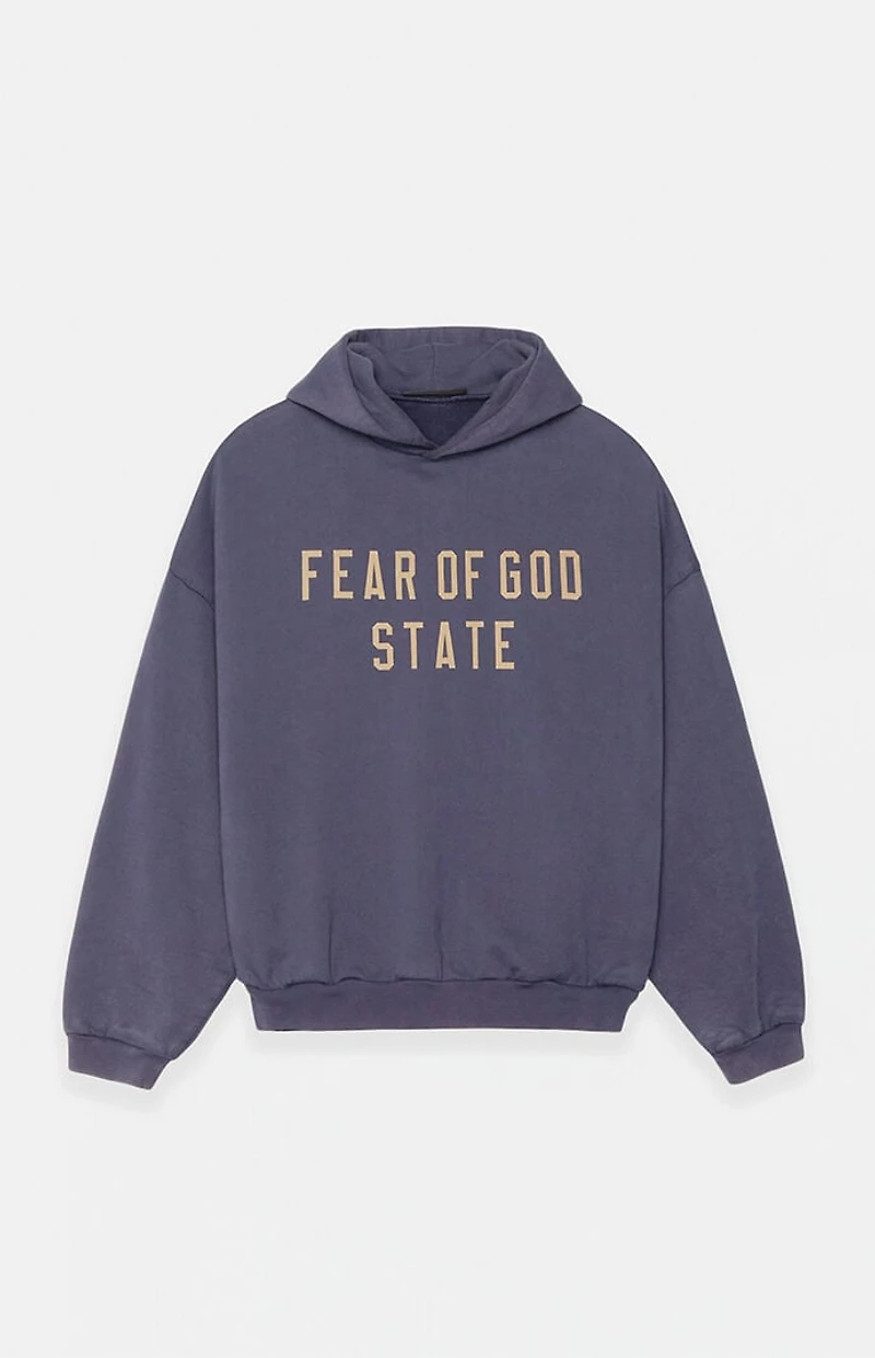 The Fear of God Essentials Marine Heavy Fleece Hoodie features a heavy fleece fabrication for a premium upgrade, long sleeves with dropped shoulders, an attached hood, a rubber brand label on the hood, side seam pockets, and a Fear of God State graphic on the front.