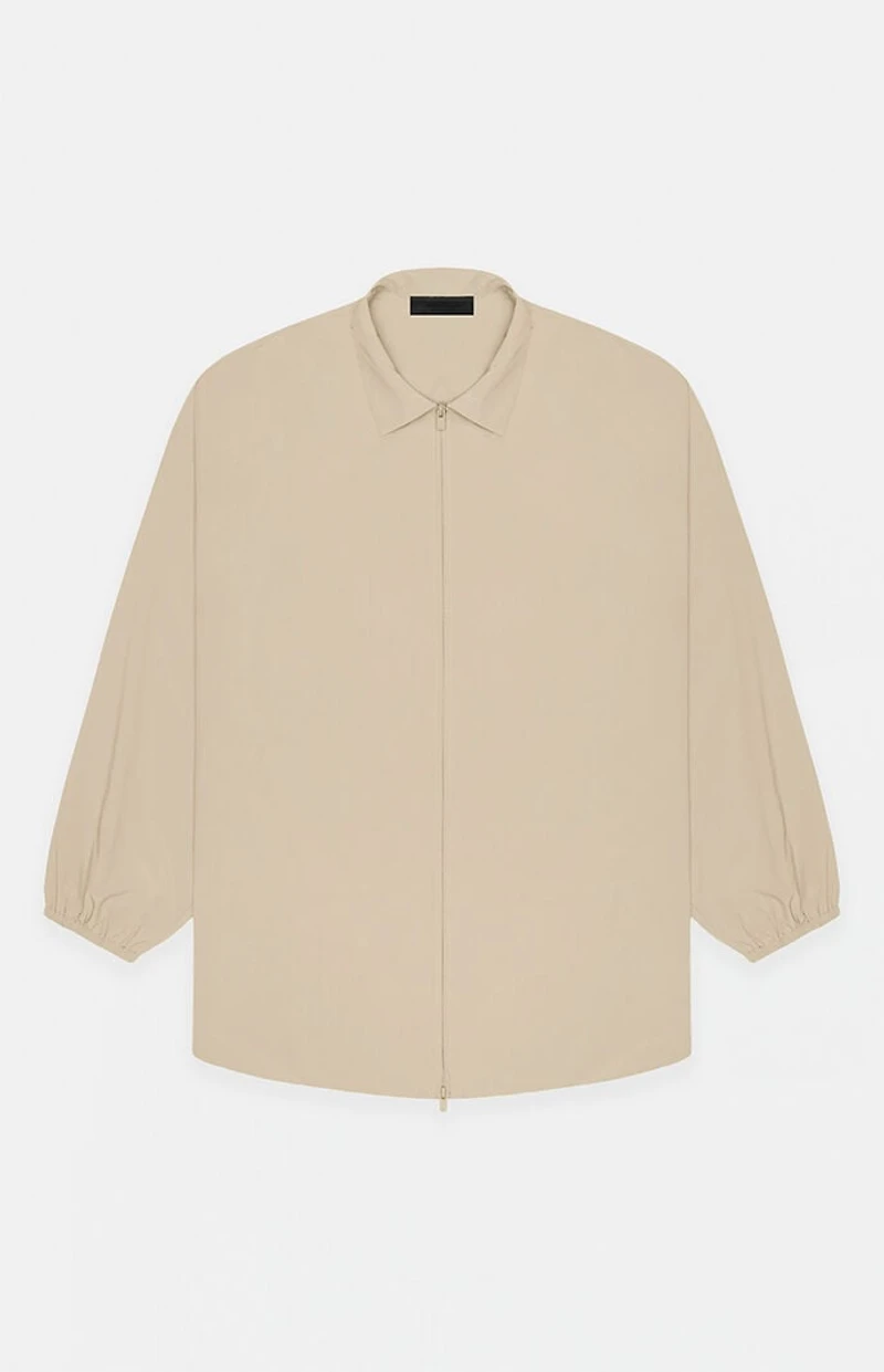 The Fear of God Essentials Mink Overshirt Jacket is made from a lightweight fabric and features a classic collar, long sleeves with dropped shoulders, side seam pockets, a full zipper front closure, and a faux leather brand label at the upper back.