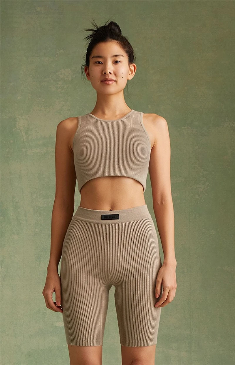 The Fear of God Essentials Women's Core Heather Biker Shorts feature a high-waisted design with an elasticized rubber logo waistband, a ribbed knit fabric, and a tight fit.