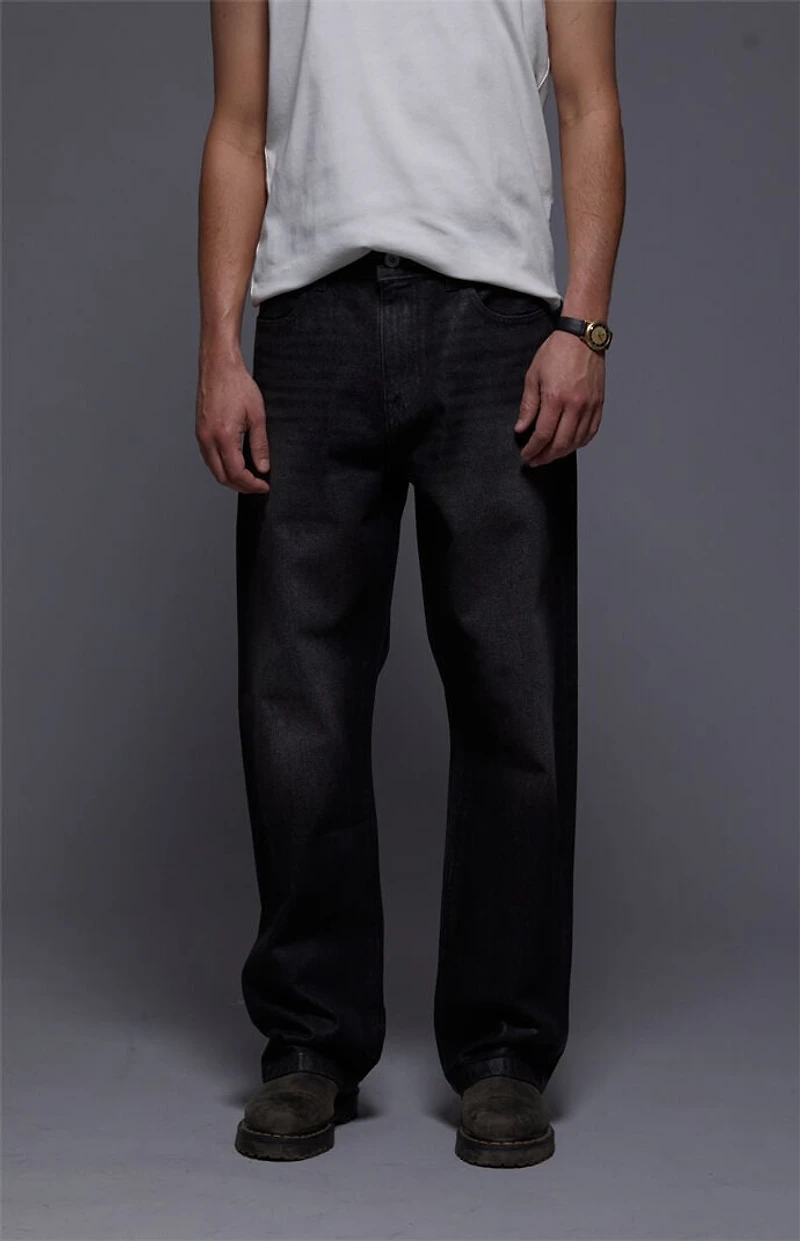 Field of Study by Pacsun Dylan Baggy Jeans in Black offer a polished, statement-making take on relaxed denim with a clean, modern silhouette. Made from sustainably sourced rigid cotton, they feature a black wash, a baggy fit from the thigh through the knee, wide leg openings, and the collection’s best relaxed fit. These jeans are updated with a high shine finish that is bold yet minimalistic, making them perfect for an elevated look.