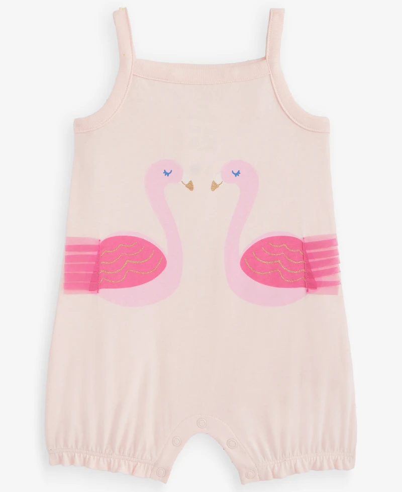 Tulle accents and fun flamingo graphics sweeten her look with this comfy one-piece sunsuit from First Impressions.