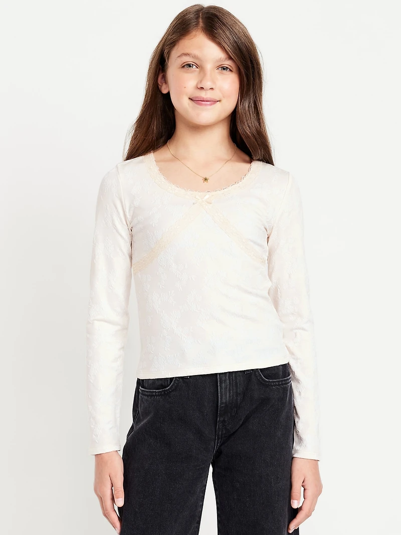 Fitted Long-Sleeve Lace-Trim Top for Girls