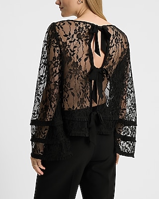 Sheer Lace Ruffle Long Sleeve Bow Back Top
