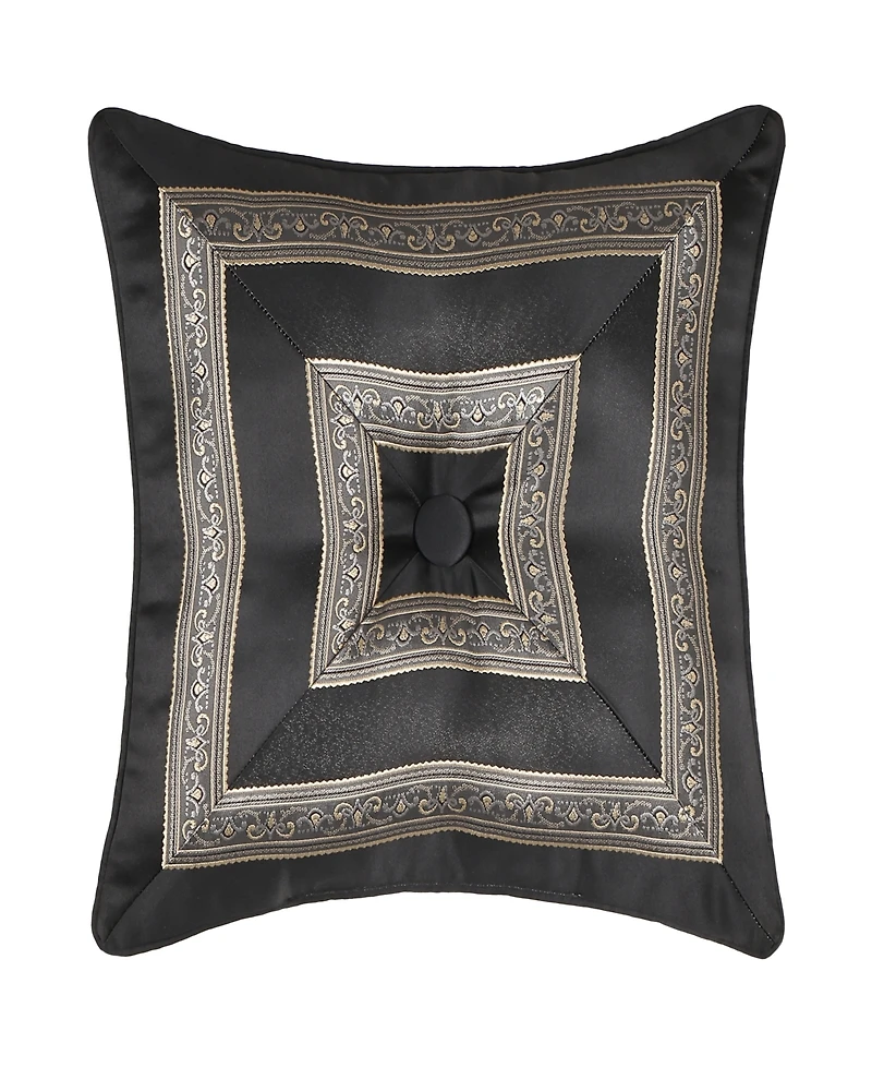 The Harriman 18"" Decorative Pillow is truly exquisite with its dramatic use of black and golden hues. The face is mitered with a woven black and gold stripe and is finished with a deeply tufted button covered in plush satin fabric, which adds an intricate detail to this accent pillow. This luxurious pillow is reversable with a black satin and a corded trim on all sides. Pair this Pillow with the Harriman bedding set and window treatments for a complete timeless traditional look.