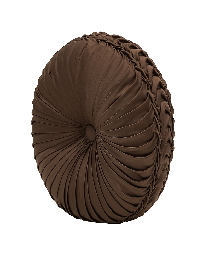The Odette Tufted Round Decorative Pillow features a soft chocolate fabric to create a one of a kind accent to this bedding ensemble. These unique pillows are sewn by hand and are finished with a fabric-covered button on both sides.