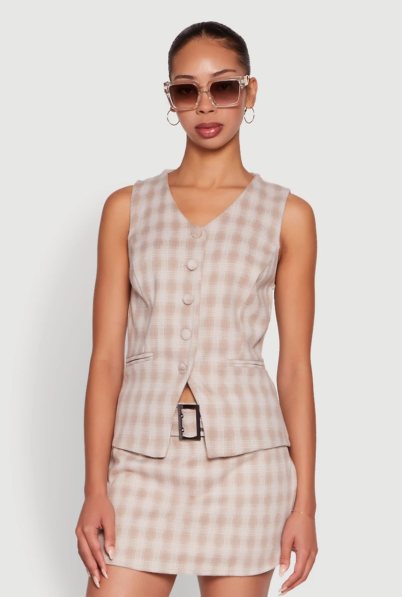 Fleece Plaid Button Front V-Neck Vest