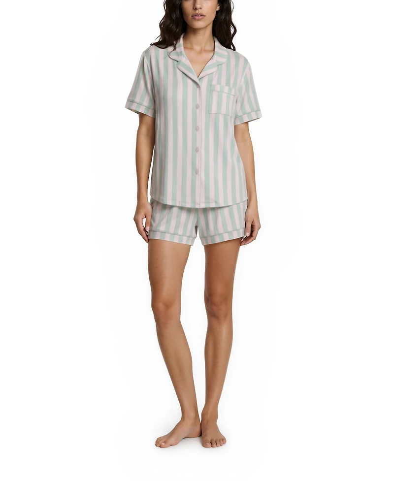Chase cozy moments in this Flora by Flora Nikrooz Gabriella pajama set, introduced with dreamy softness, piping details, and a notch-collar short-sleeve top for polished sleepwear style. Matching pull-on shorts include pockets, while the high-rise elastic waistband and above-knee fit keep movement easy and comfort relaxed.