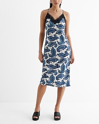 Satin Printed Lace Trim V-Neck Midi Downtown Cami Slip Dress
