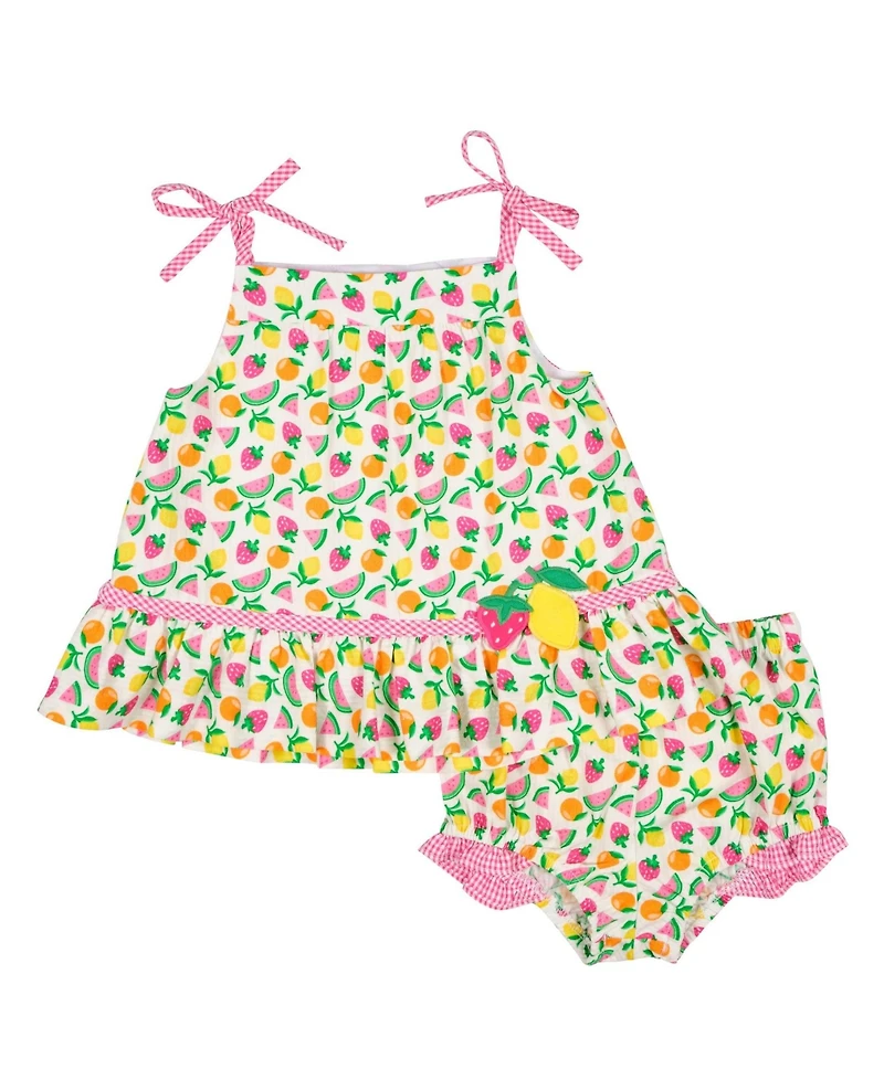 Sweet and sunny, this two-piece set is crafted from white seersucker printed with colorful fruit for a fresh, warm-weather feel. Bright pink check seersucker trim adds a playful contrast, while applique strawberry and lemon details bring cheerful charm. Shoulder ties give the dress an airy, adjustable finish. Designed with a yoke silhouette, gentle shirring, and a hem ruffle, the dress falls above the knee for easy movement. The coordinating bloomer features elastic at the waist and ruffled legs for comfort and coverage—perfect for sunny vacations, seaside outings, and picture-perfect days.