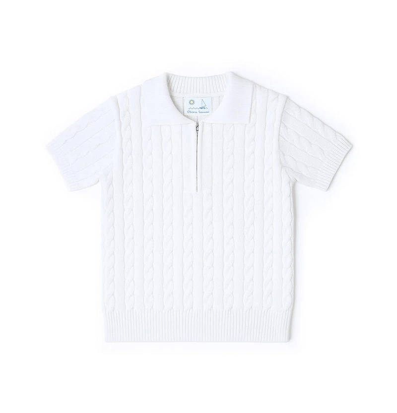 Classic and lightweight, this white polo-style sweater is knit from soft 100% cotton with a timeless cable pattern. The short sleeves make it perfect for warm-weather layering, while a front zipper adds a polished, sporty finish.Comfortable and versatile, it pairs effortlessly with pants, shorts, or skirts—ideal for school days, spring outings, and picture-perfect moments. A fresh take on a heritage favorite, designed for comfort, ease, and everyday style.