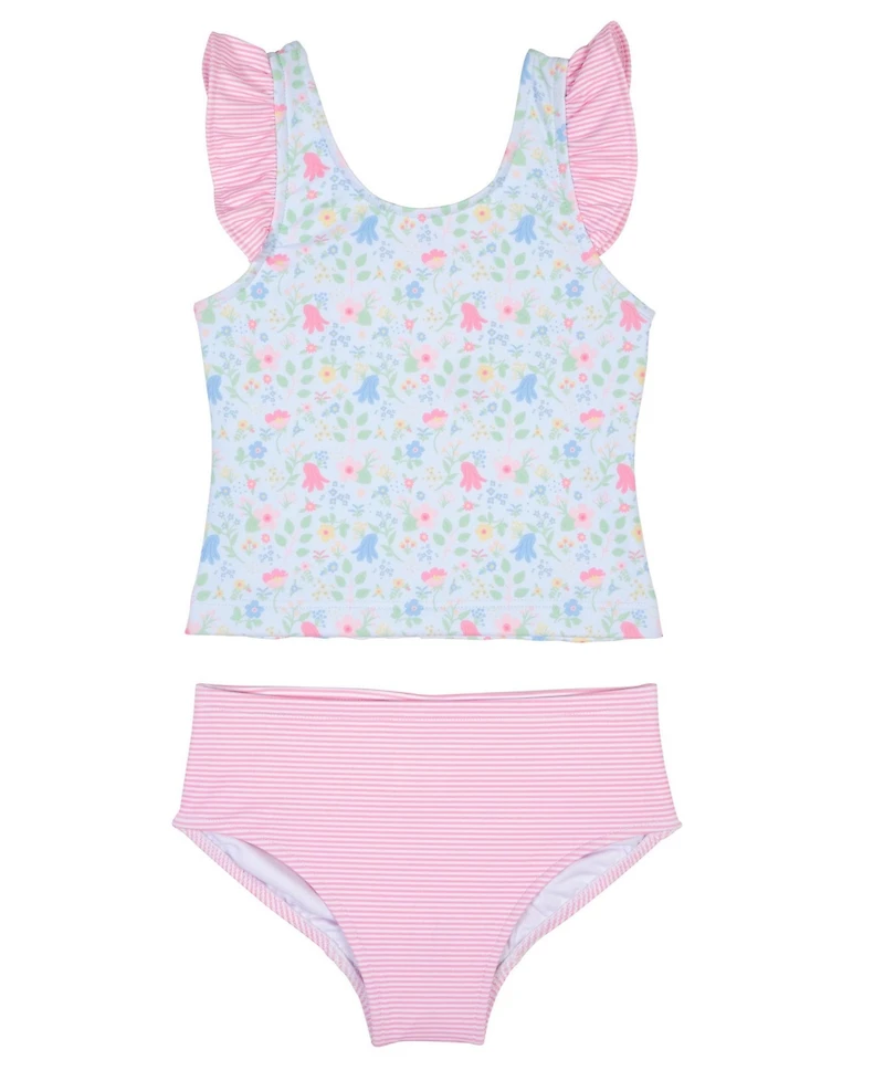 Bright, cheerful, and ready for sunshine, this tankini features our custom blue and multicolor floral print paired with coral-and-white mini stripe accents. Stripe ruffles and a sweet back bow add playful texture and charm, making it a standout for warm-weather days.Crafted from a soft, stretchy nylon-spandex blend, the bottoms are designed with shirred back legs to help the suit stay comfortably in place during swim and play—perfect for beach outings, pool days, and vacation adventures. A vibrant swim favorite made for comfort, color, and carefree fun under the sun.