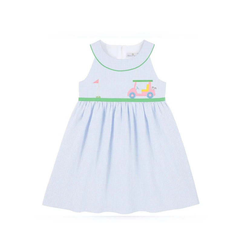 Classic and playful, this dress is crafted from blue and white check seersucker in soft, breathable 100% cotton—perfect for warm-weather days. A cheerful applique golf cart adds a sporty touch, while green spaghetti cording and back waist ties bring a pop of color and a charming finish.Designed in a timeless waist dress silhouette with a softly shirred skirt, it offers easy movement and comfort. A back zipper keeps dressing simple, and the knee-length hem makes it ideal for sunny outings, resort dinners, and picture-perfect vacation moments.