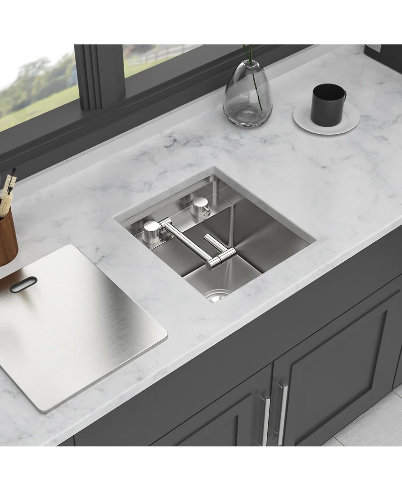 Add smart design and modern luxury to your kitchen with this versatile 15 inch undermount bar sink. Crafted from durable 16 gauge stainless steel, it features a unique folding faucet, a concealable lid, and a deep basin. Complete with essential accessories, it creates a sleek, functional, and quiet workspace perfect for any home.
