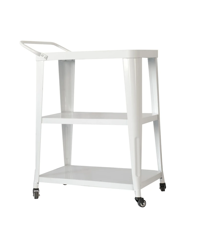 This white 3-tier metal cart has all-metal frame, swivel rollers, ergonomic handle, compact size (33.7""H x 24.6""W x 13.8""D), versatile for kitchen/bar/serving use, simple assembly.
