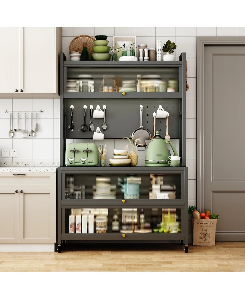 This 39.4""W x 15.7""D x 65""H bakers rack has 5 tiers, 3 Pc flip-door cabinets, 10 pegboard hooks, fixed feet and casters. Made of sturdy carbon steel (330lbs load-bearing), water-resistant, assembles in 15 mins, works as microwave stand, coffee bar or bookshelf.