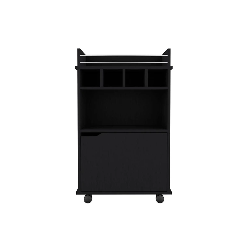 This bar cart has 4 bottle slots (4.4""W x 15.7""D x 3.9""H), 19.6""W x 13.5""H cabinet space, 19.6""W x 15.5""D open shelf, simple assembly, premium durable materials.