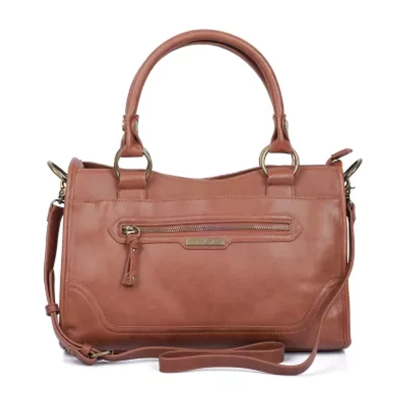 The Frye and Co. Satchel combines timeless design with refined detailing. Crafted with a gold-tone buckle and secure zipper closure, it includes two inside cell phone pockets, one inside zip pocket, and one front zip pocket for easy access to essentials. This spacious satchel offers everyday elegance.